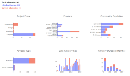 Finding the data I needed only took a few minutes of Google search from an Indigenous Services Canada website that mapped the water advisories by counts of advisories by FN community, project status, advisory dates, and project type.