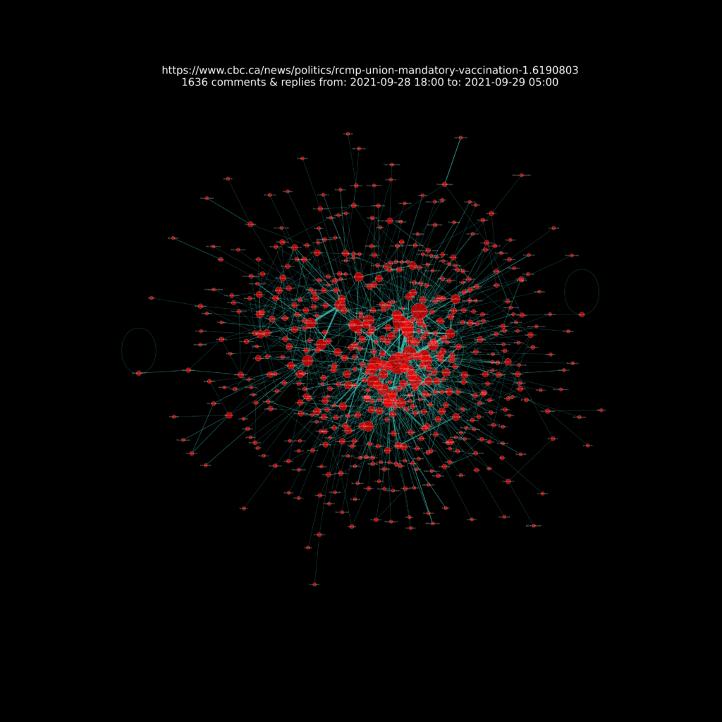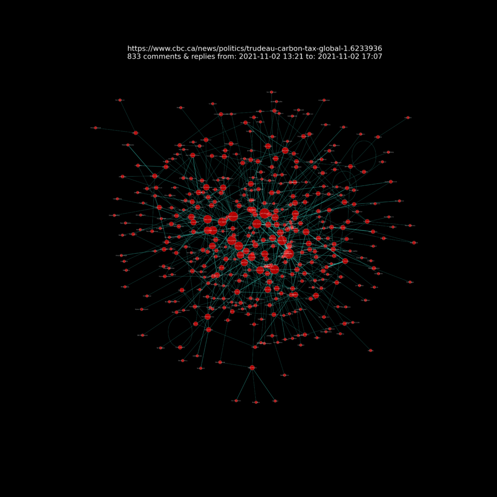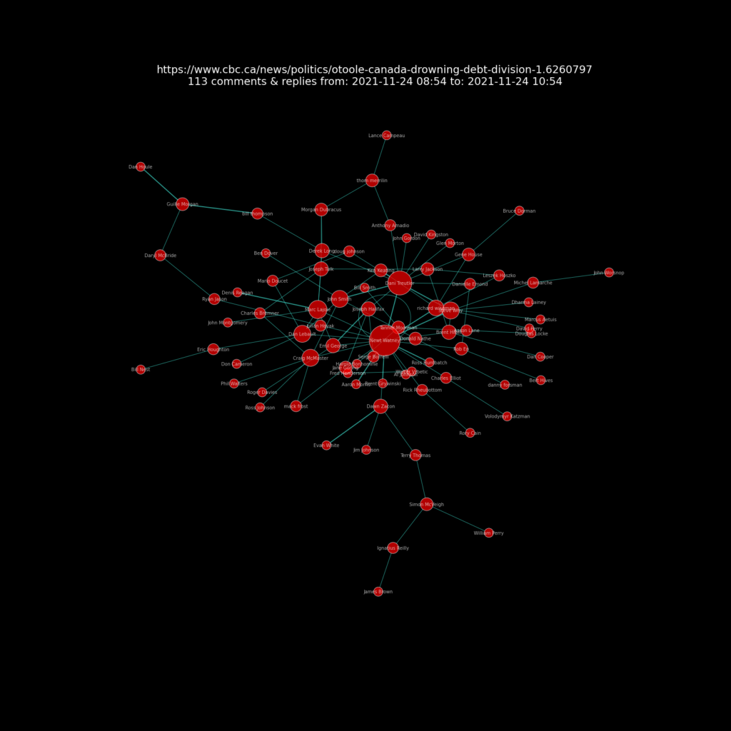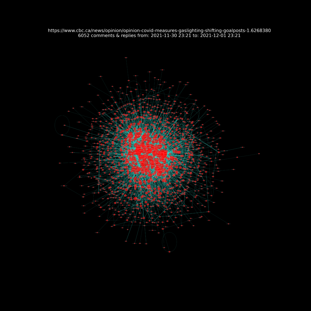 A presentation of the resulting network charts for each article I analysed can be seen at this Github repository web page  https://sitrucp.github.io/cbc_comments/image_grid.html.