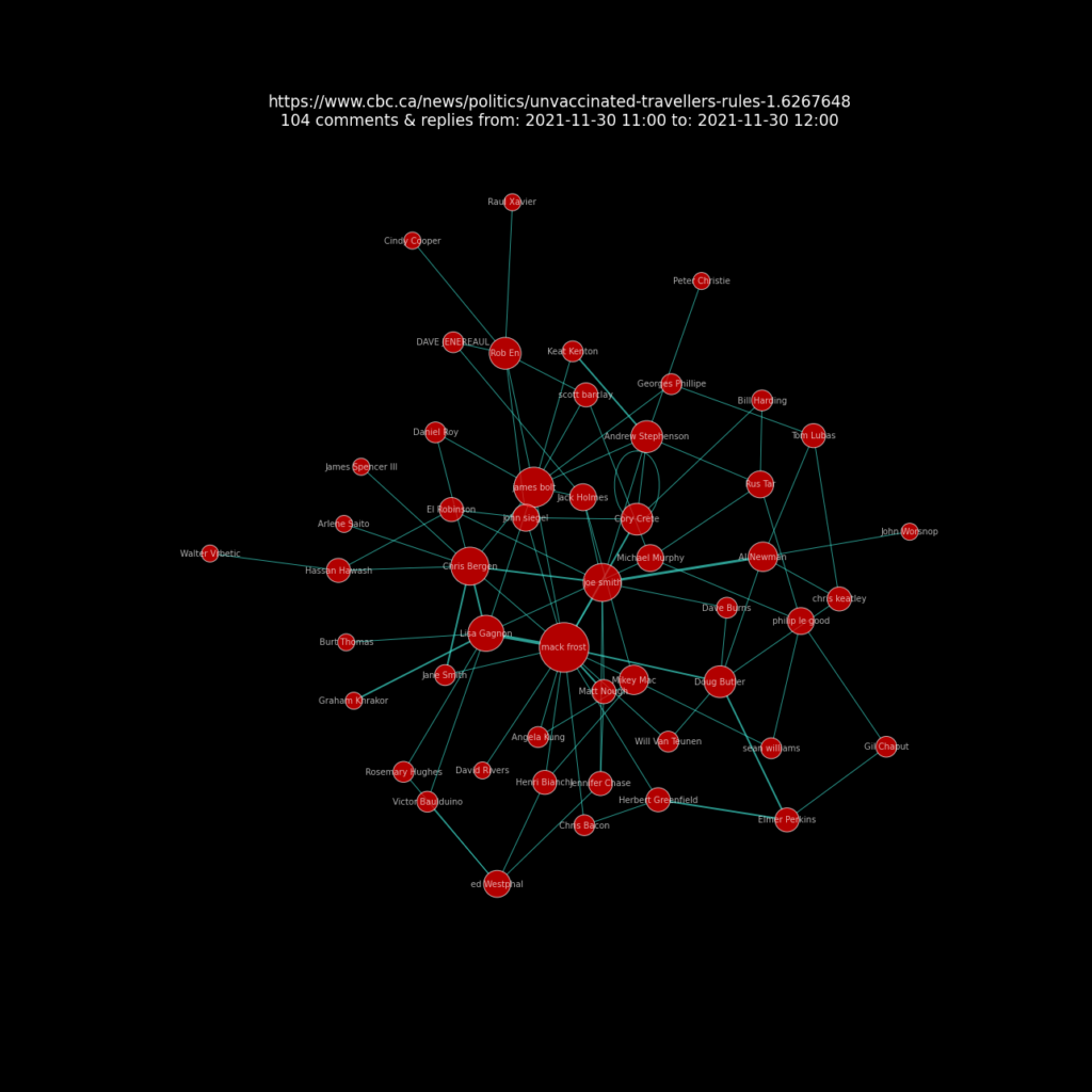 The first network chart below only contains 104 comments and replies on the article  Unvaccinated travellers over the age of 12 barred from planes and trains as of today.  This provides a very clear simple view of the nodes and lines.