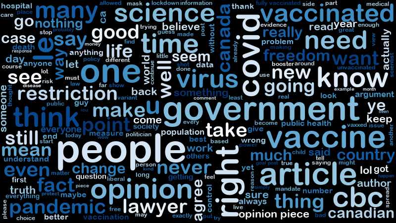 This post is focuses on a project of the analysis of scaped comments from CBC News website articles. (BTW, there are lots of “CBC’s” in the world. The one I am referring to is the Canadian Broadcasting Corporation.) Another post details web scraping method used to get the articles and their comments.