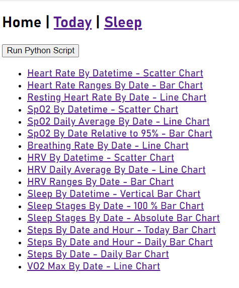 To automate data acquisition from the Fitbit Web API, I created automated processes that retrieves data from the Fitbit Web API, saves it in a MongoDB database, and then visualizes data in web pages using Node.js, HTML, Javascript, and Plotly.js.