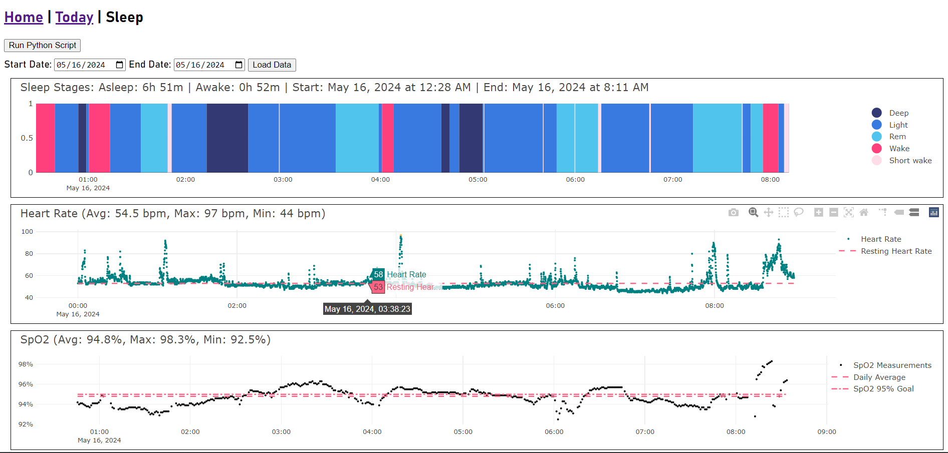 Set of visualizations of the previous night’s detailed sleep activity as well as SpO2, heart rate and HRV. Standard Fitbit data presentations in the app and on the web do not contain this granular second level detail which is captured by the device and available through the Web API.
