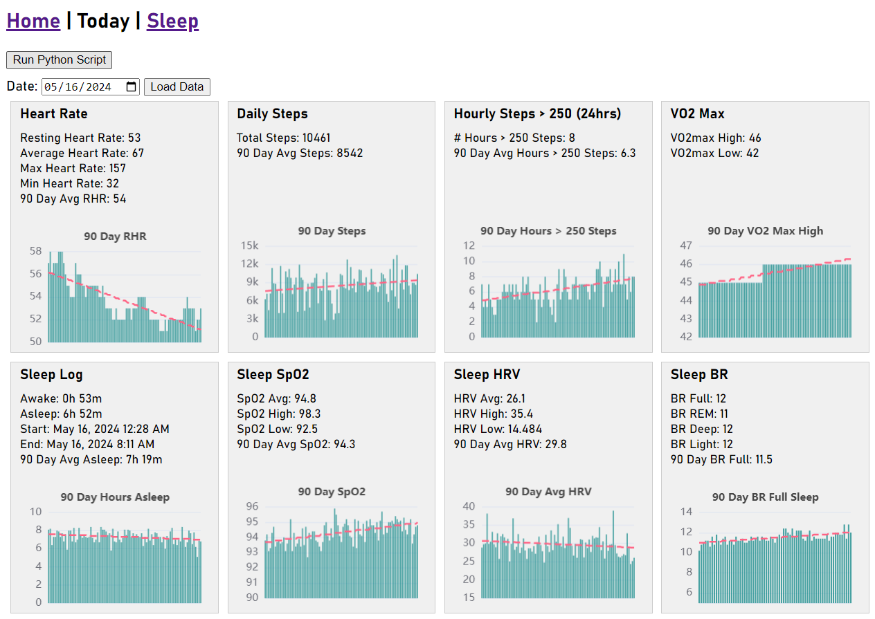 There are two main summarized purpose driven reports, a Today report summarizing today’s data along with past 90 days history and a Sleep report the presents the last night’s sleep data.