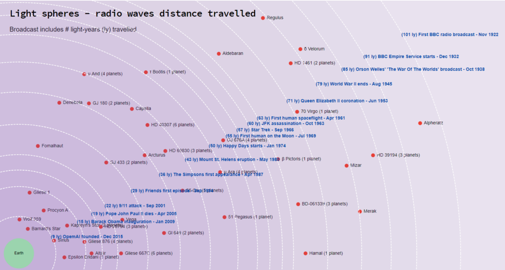 This visualization is a modified version of the very cool “The infographic book of space – Light Spheres” https://cosmos-book.github.io