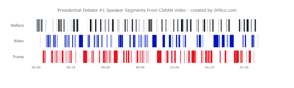 TLDR: I used Amazon Transcribe to transcribe the first presidential debate audio that included timestamps for each word, to create the following speaker timeline visualization (created using a Plotly timeline chart). Click image to view full size visualization.